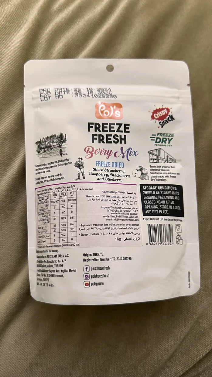 @PolsArabia Berries mix are a delicious, healthy snack packed with flavor. They have the perfect balance of sweetness and tartness, making them a satisfying treat. The quality is top-notch, and they’re great for on-the-go munching or adding to cereals and desserts. Highly recommend for berry lovers!