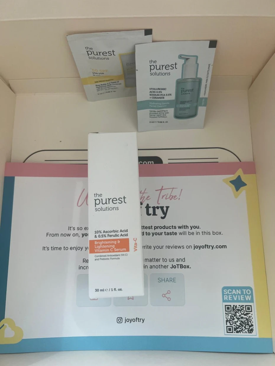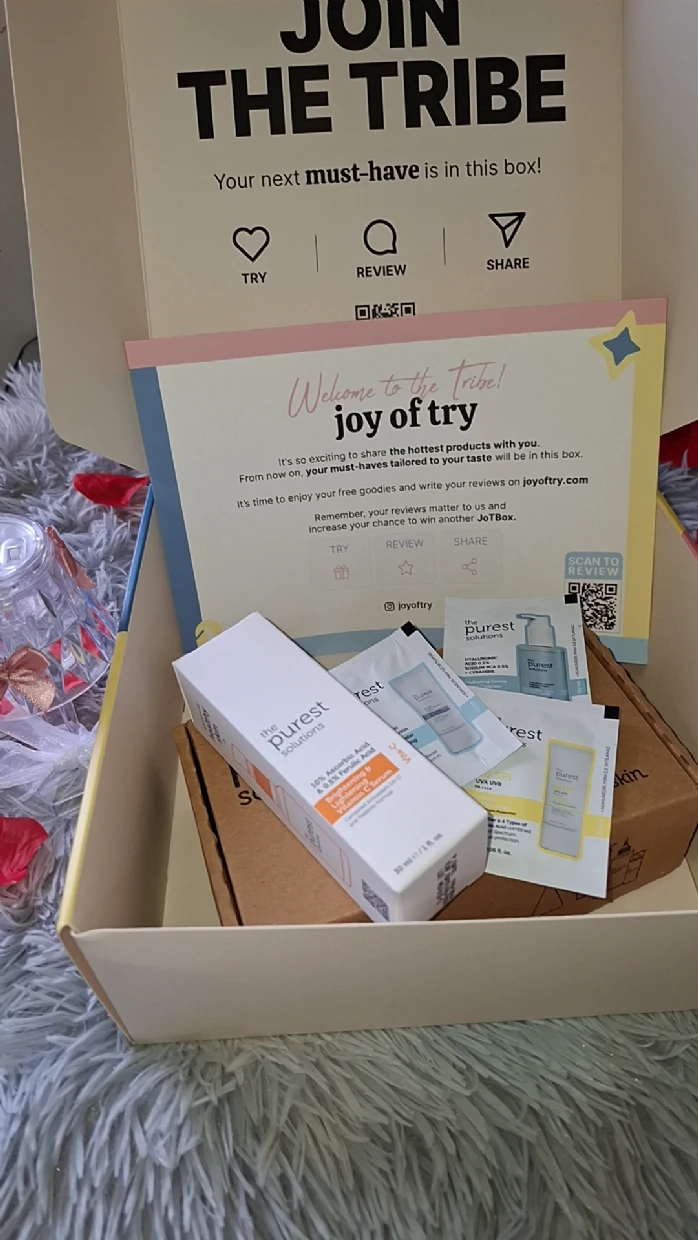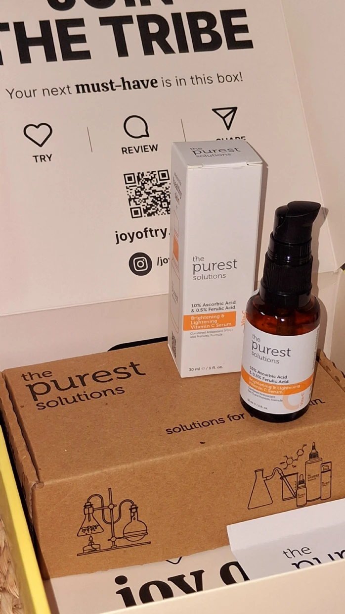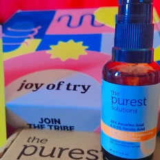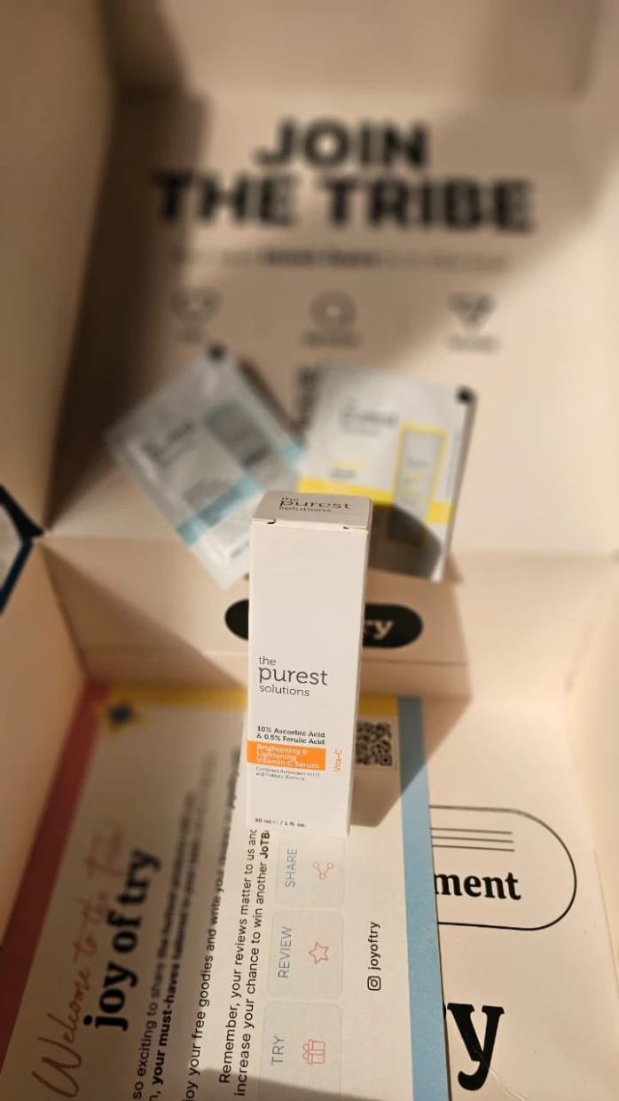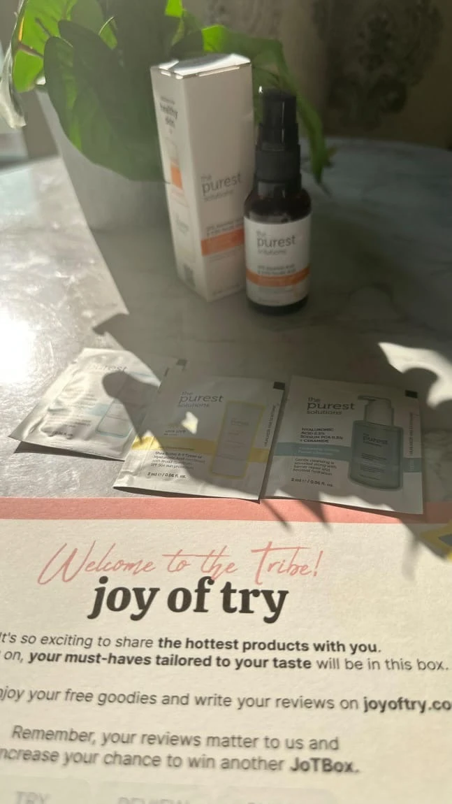 “I recently got my hands on the Purest Solutions skincare products through Joy of Try, and I’m genuinely impressed! The packaging is super cute and eco-friendly, which is a huge plus. I tried the 10% Ascorbic Acid serum, and it left my skin feeling refreshed and glowing. The samples provided are great for on-the-go use, and the information cards make it easy to understand the product benefits. Highly recommended for anyone looking to elevate their skincare routine!