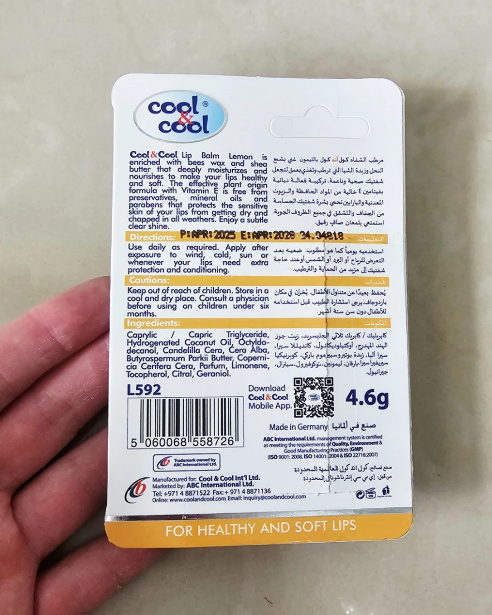 I absolutely love this Cool & Cool Lemon Lip Balm — it’s lightweight, smells fresh, and keeps my lips soft even in the dry Middle East weather. The mix of beeswax, vitamin E, and shea butter works perfectly to protect against heat and dehydration. It gives a natural shine without feeling sticky. I use it daily and always keep one in my bag — a great choice for UAE residents!