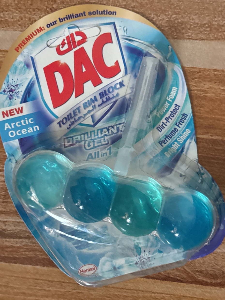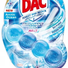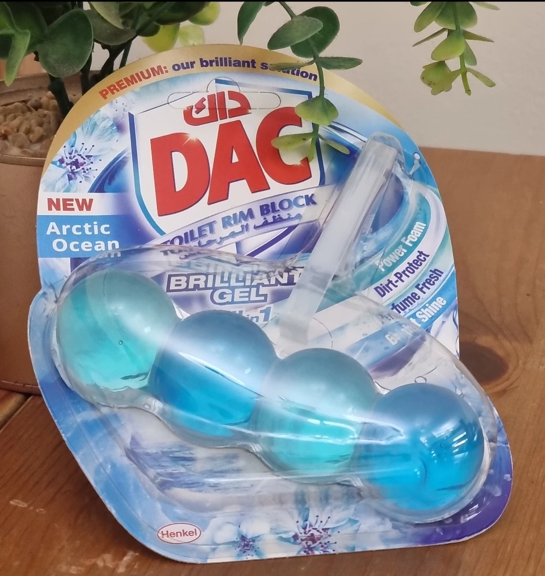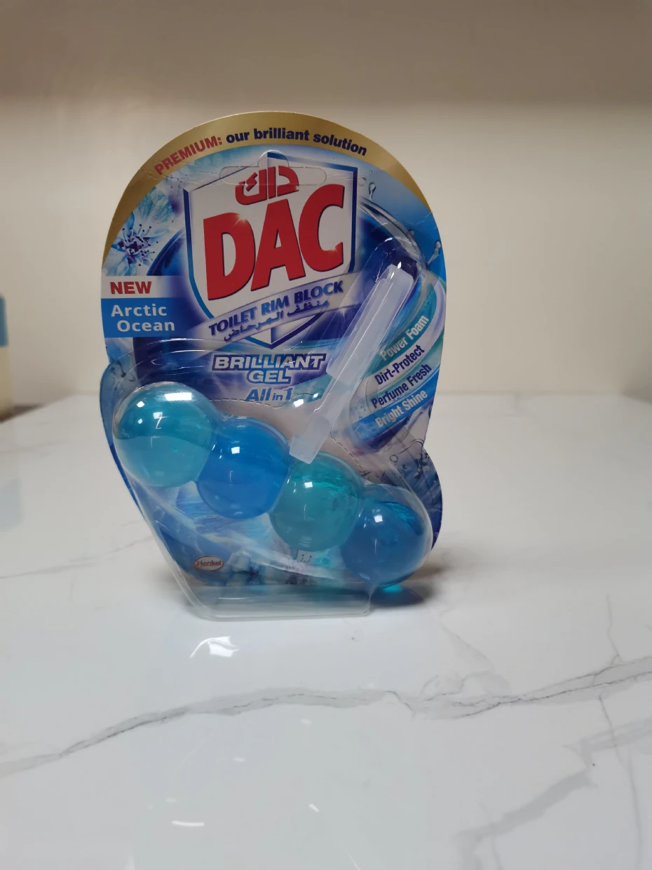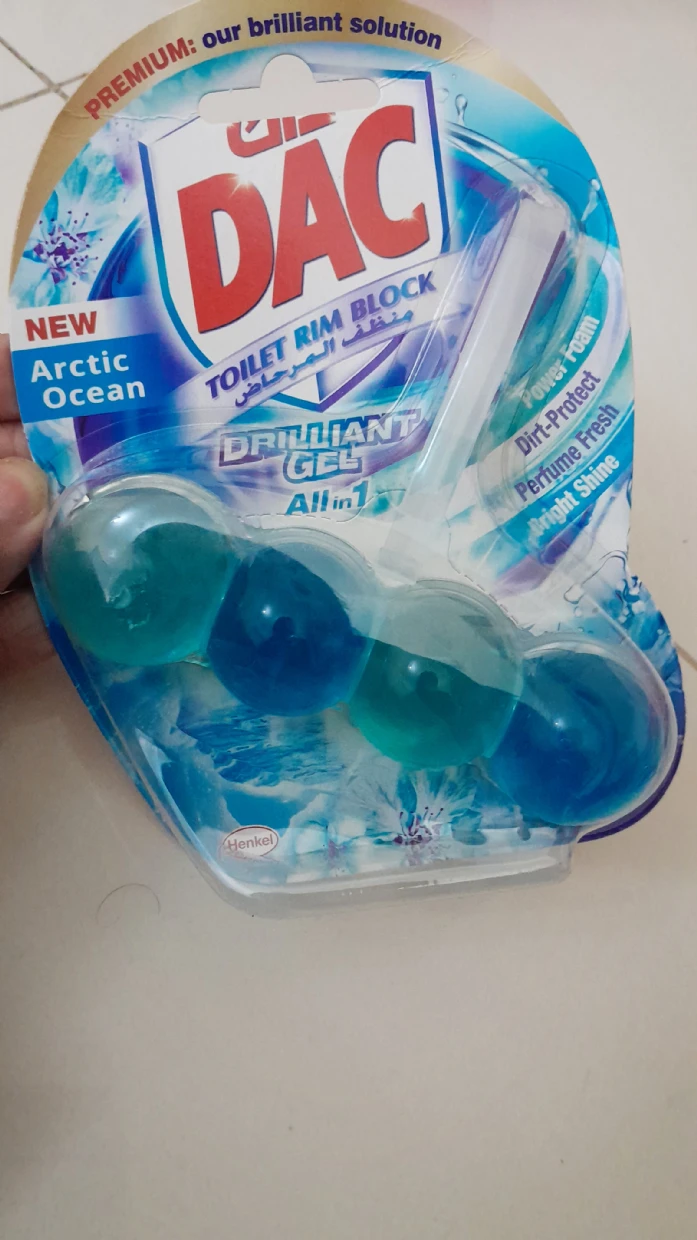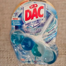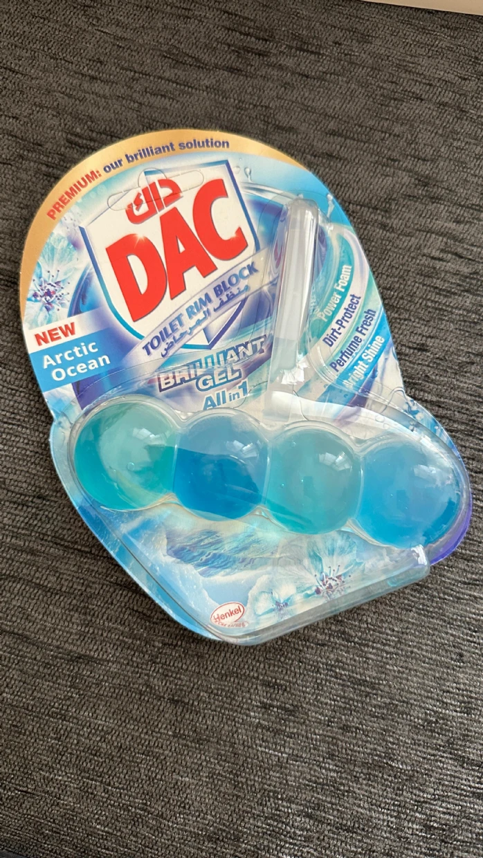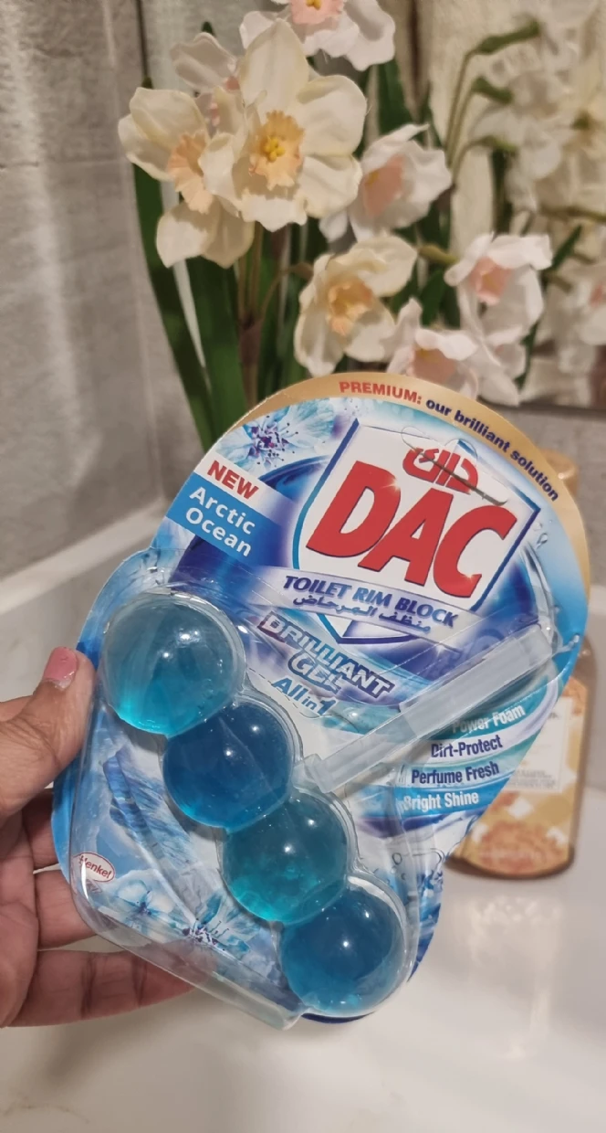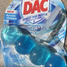 The DAC Toilet Rim Block in New Arctic Ocean is fantastic! The Perfume Fresh scent is refreshing, and the Brilliant Gel formula with Power Foam cleans and shines effortlessly. The Dirt-Protect feature keeps the toilet cleaner for longer, and the Bright Shine gives it a polished look.