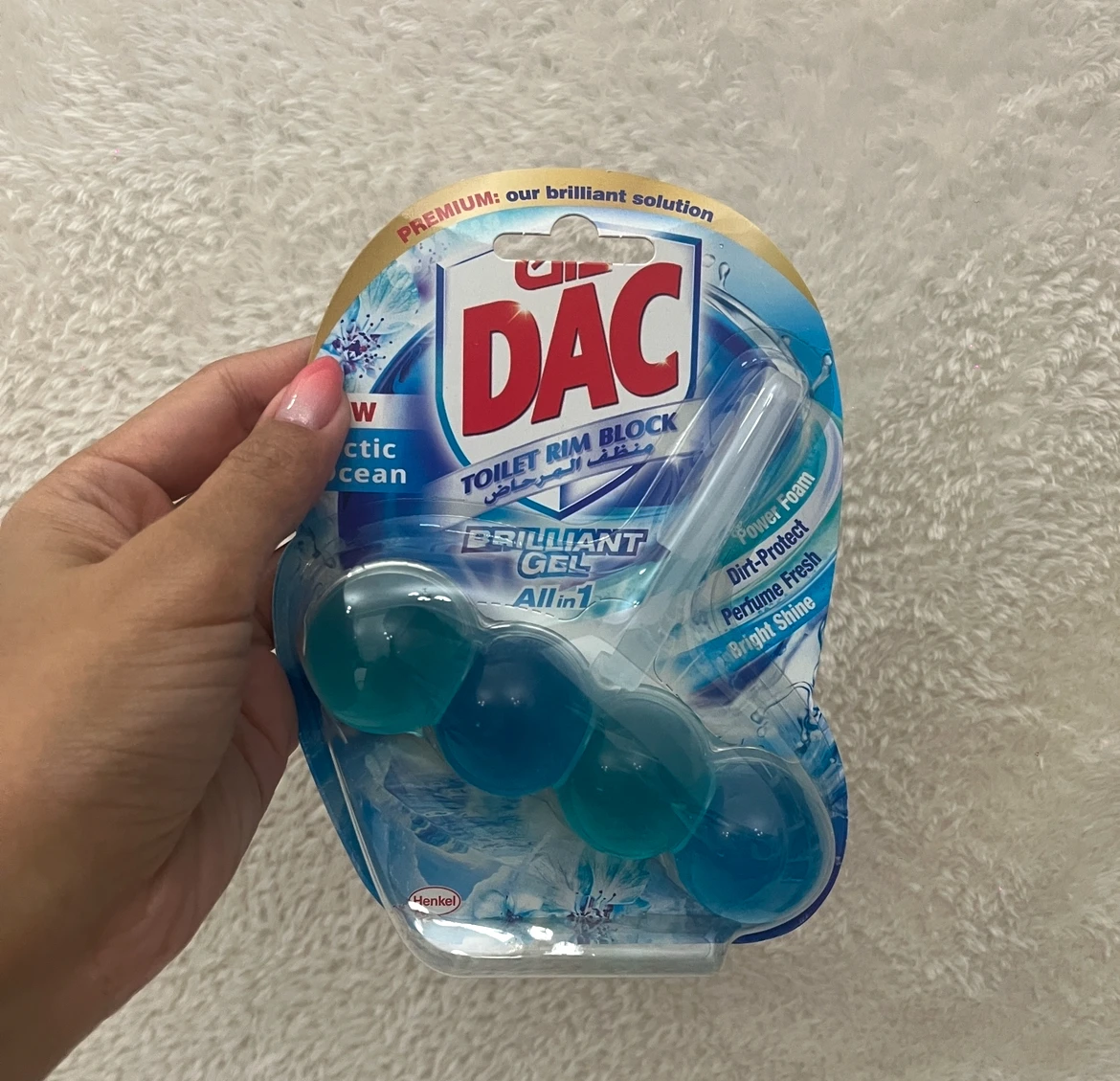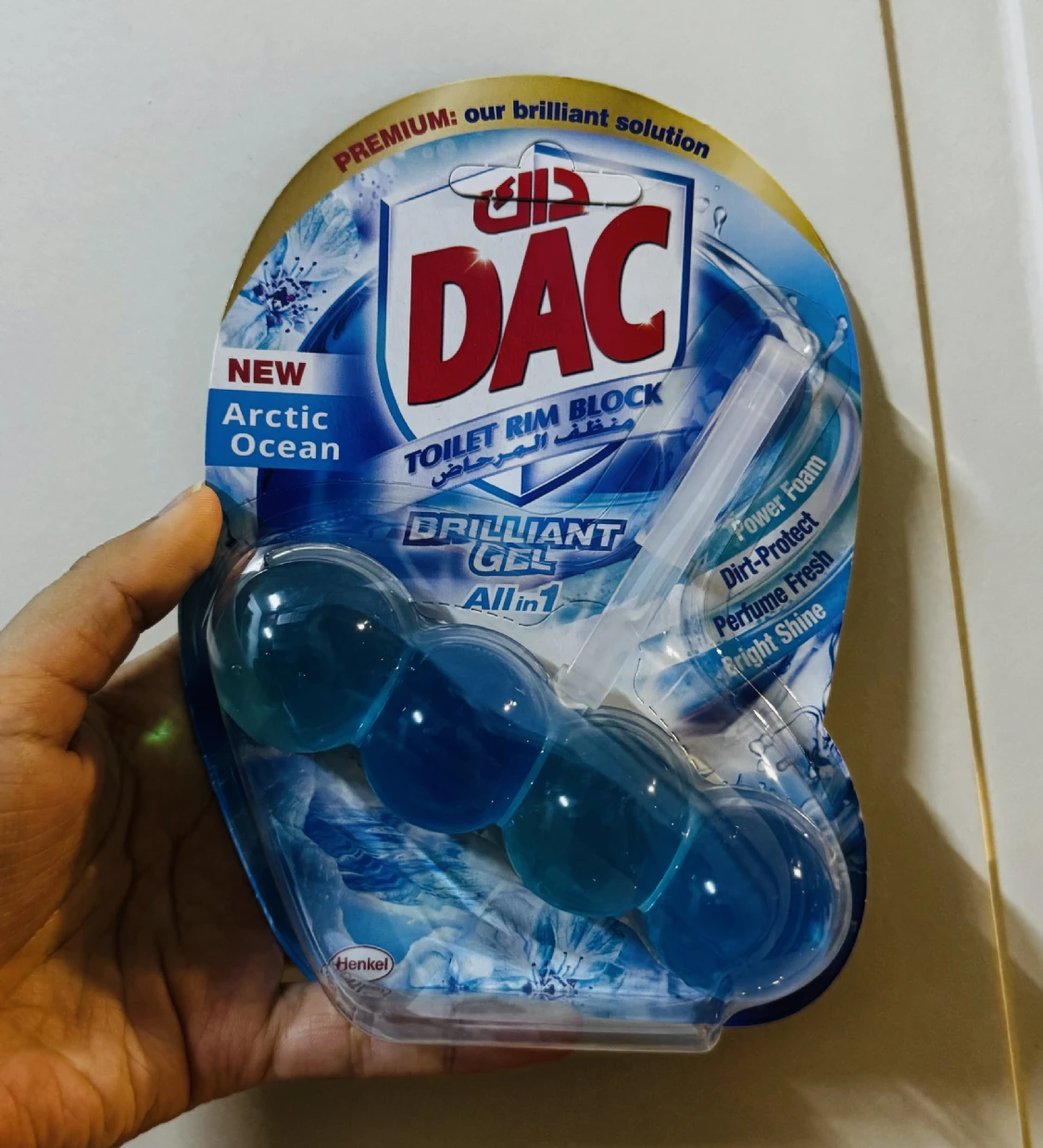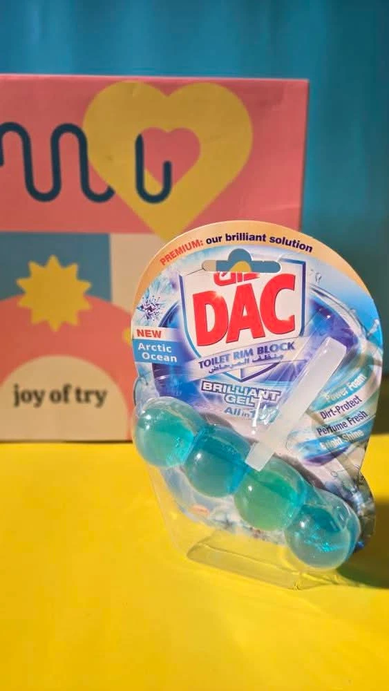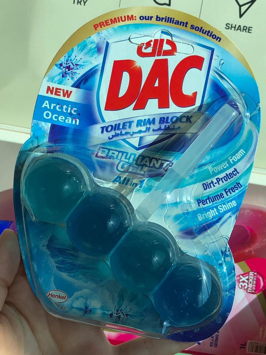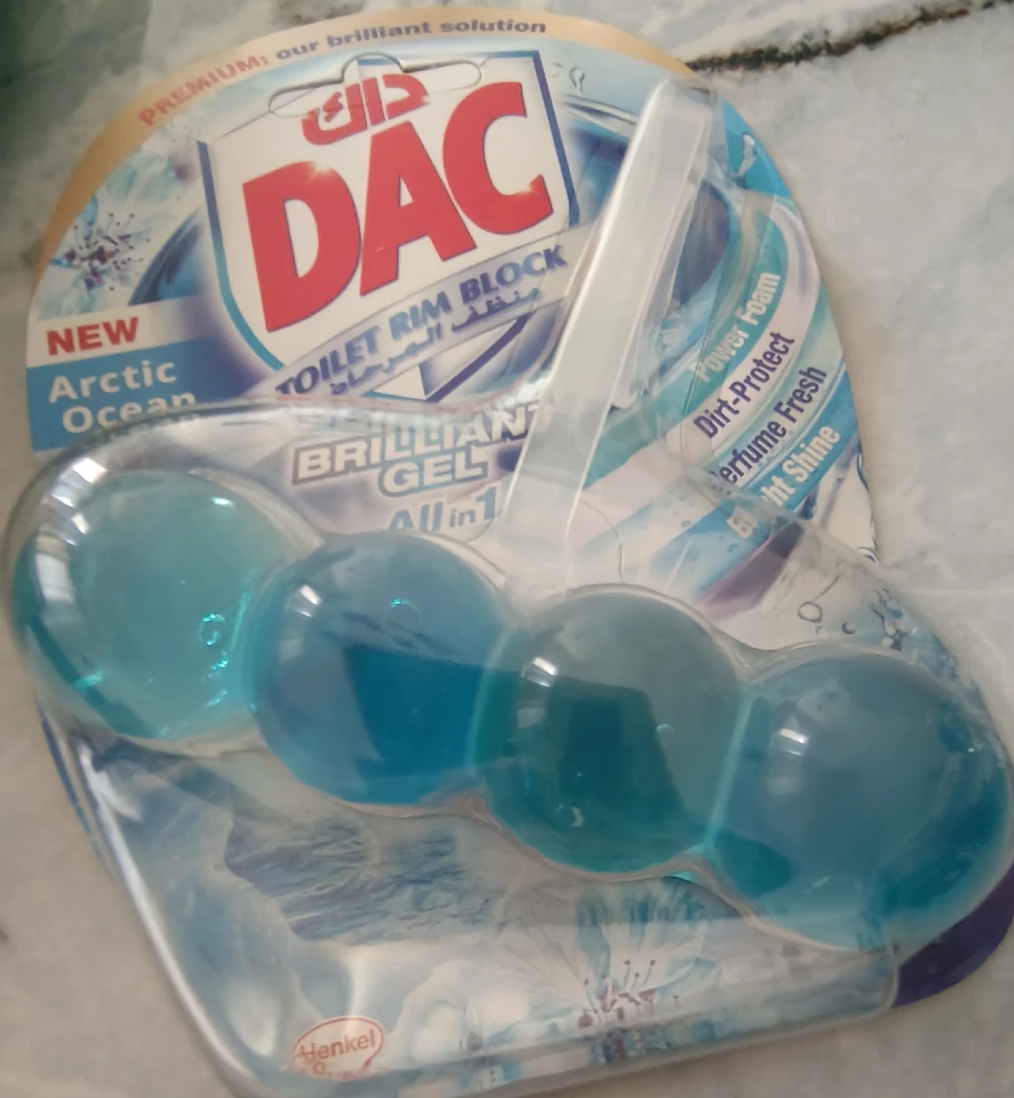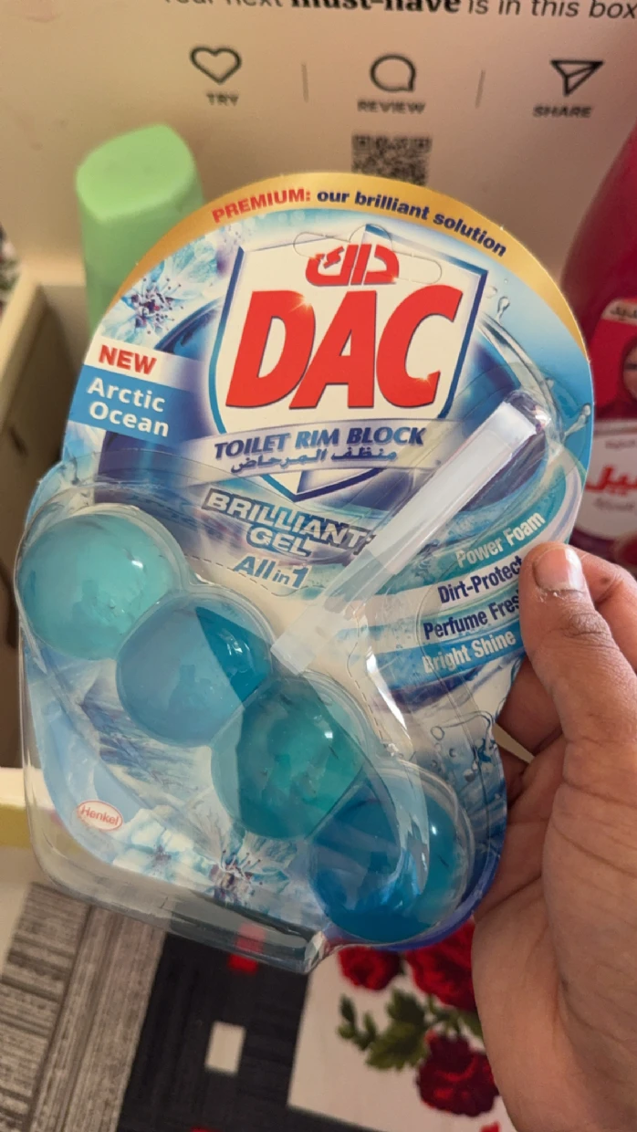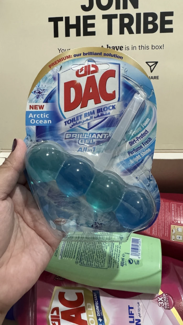The DAC Toilet Rim Block in New Arctic Ocean is fantastic! The Perfume Fresh scent is refreshing, and the Brilliant Gel formula with Power Foam cleans and shines effortlessly. The Dirt-Protect feature keeps the toilet cleaner for longer, and the Bright Shine gives it a polished look.