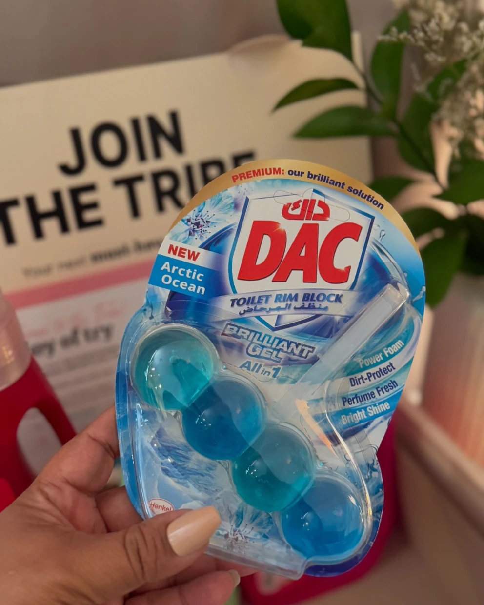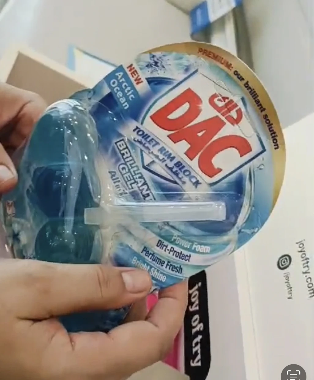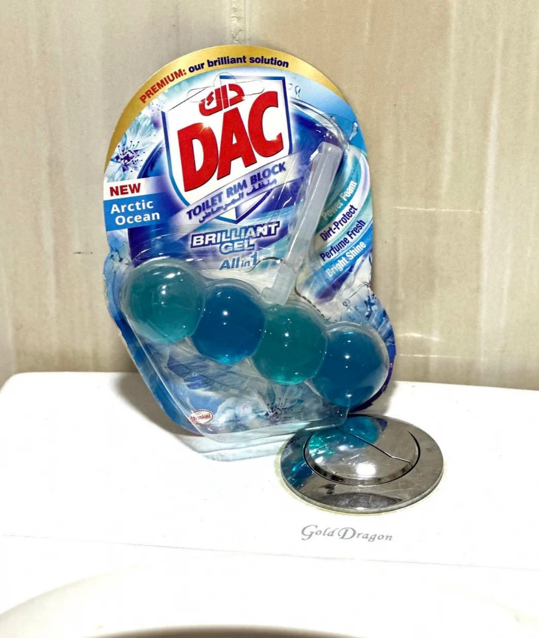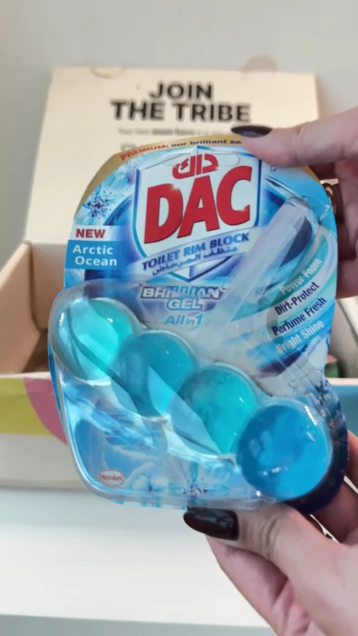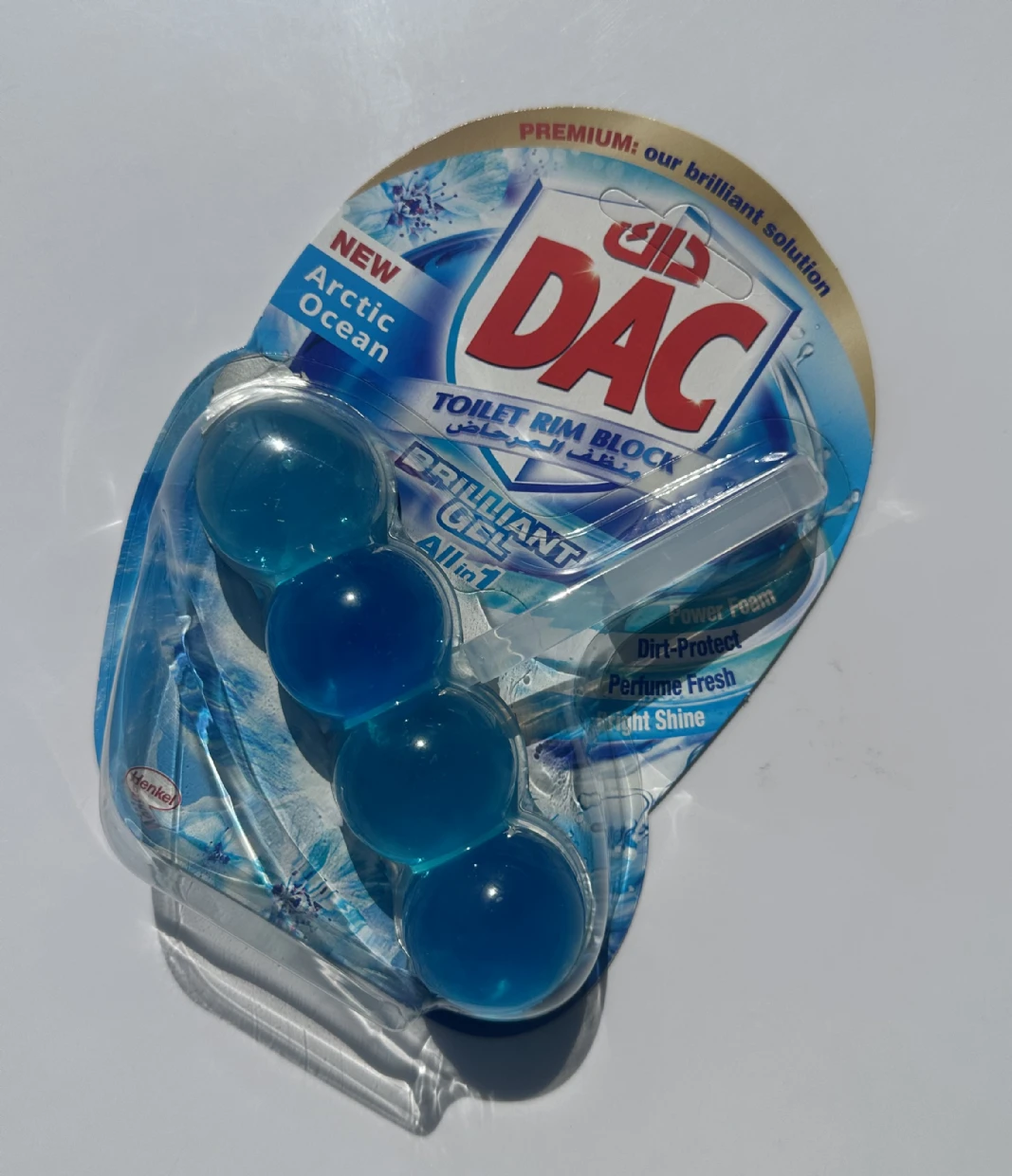 The DAC Toilet Rim Block in New Arctic Ocean is fantastic! The Perfume Fresh scent is refreshing, and the Brilliant Gel formula with Power Foam cleans and shines effortlessly. The Dirt-Protect feature keeps the toilet cleaner for longer, and the Bright Shine gives it a polished look.