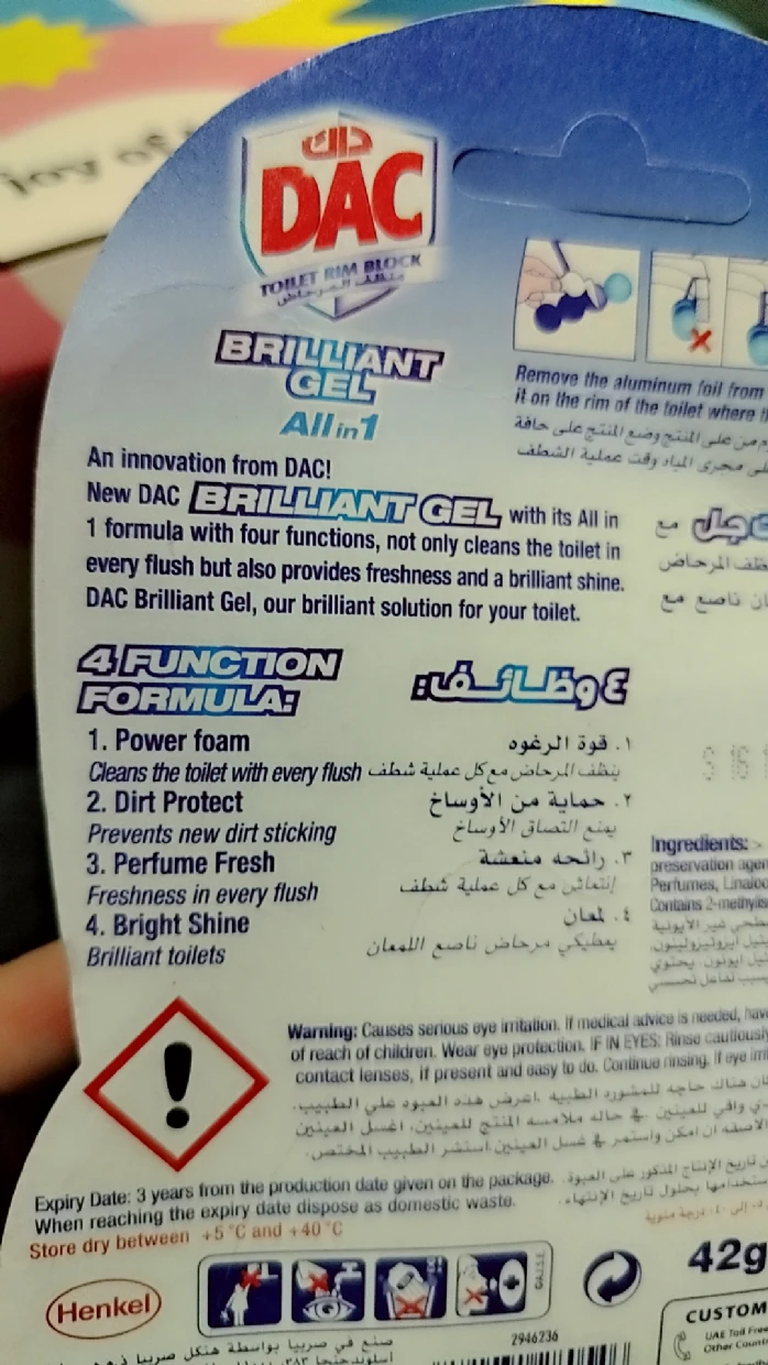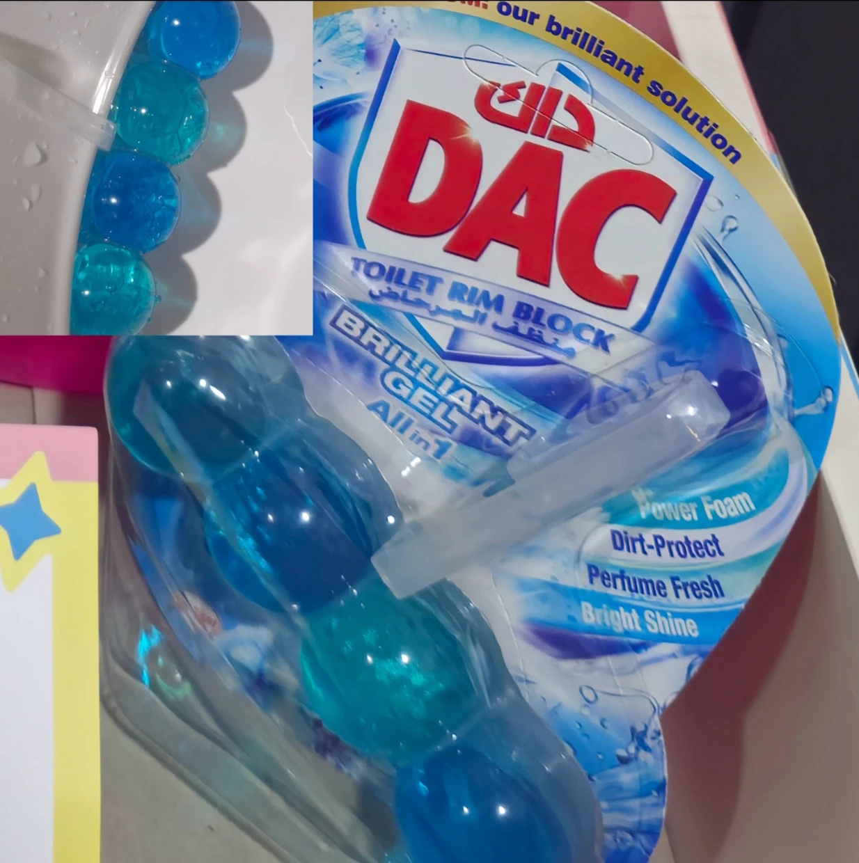Dac brilliant gel works really well as a toilet rim cleaner . It protect the dirt , keeps the toilet odorless , shines bright . The best part is there’s foam and cleans the toilet really well after every use . The most important house hold product .