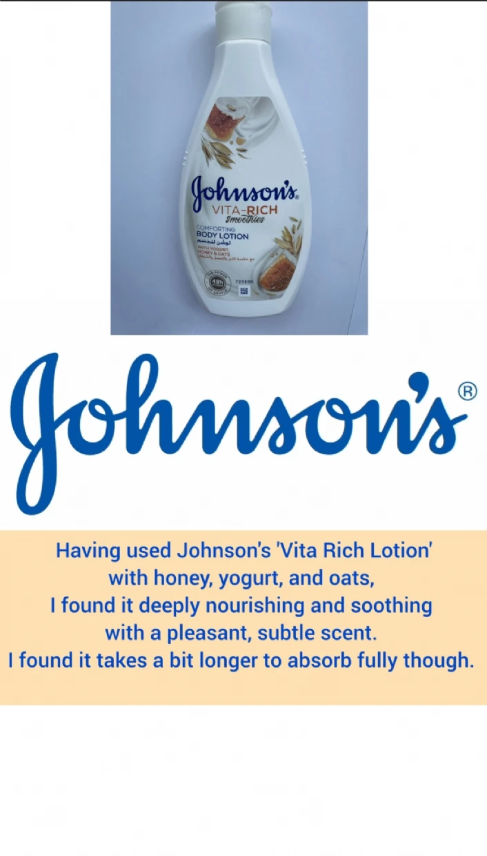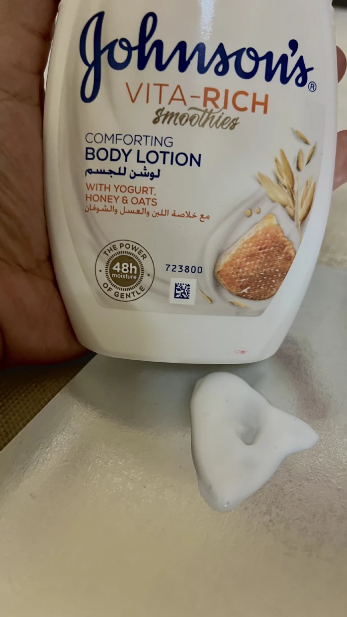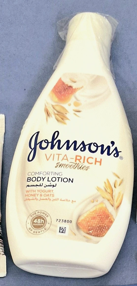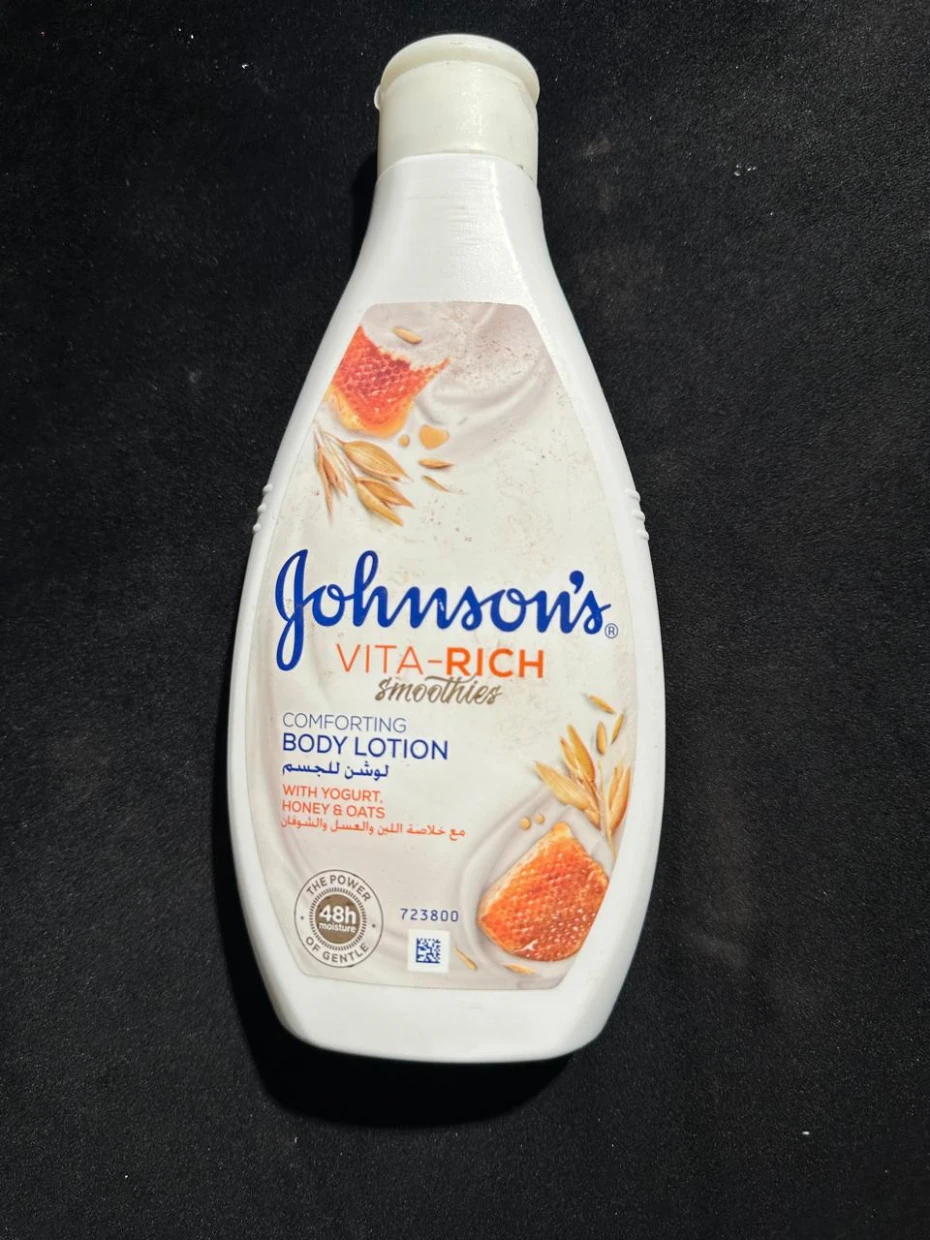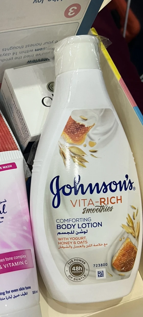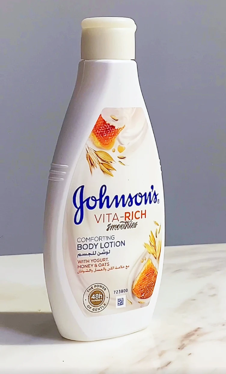 Johnson’s Body Lotion with Yogurt, Honey, and Oats offers a nourishing and soothing experience for the skin. The lotion has a creamy texture that spreads easily and absorbs quickly, leaving the skin feeling soft and moisturized without any greasiness. The scent is a delightful combination of sweet honey and warm oats, with a subtle hint of yogurt that gives it a cozy, comforting aroma. The fragrance lingers pleasantly on the skin, making it a great choice for those who enjoy mild, sweet scents. Enriched with natural ingredients, this lotion is ideal for dry or sensitive skin, providing long-lasting hydration and a gentle, soothing effect. Overall, it’s a perfect daily moisturizer for anyone looking for a luxurious yet affordable skincare option.