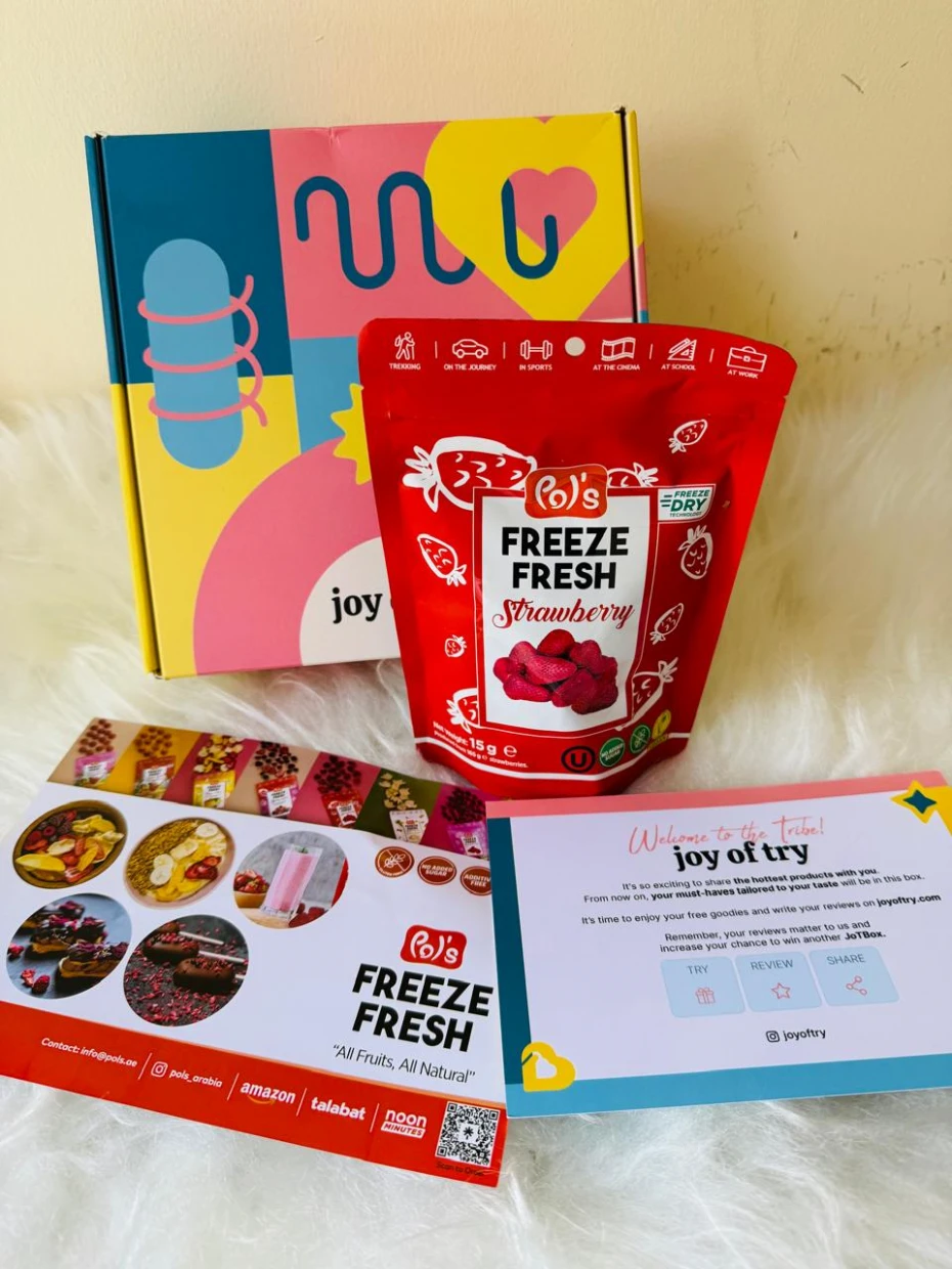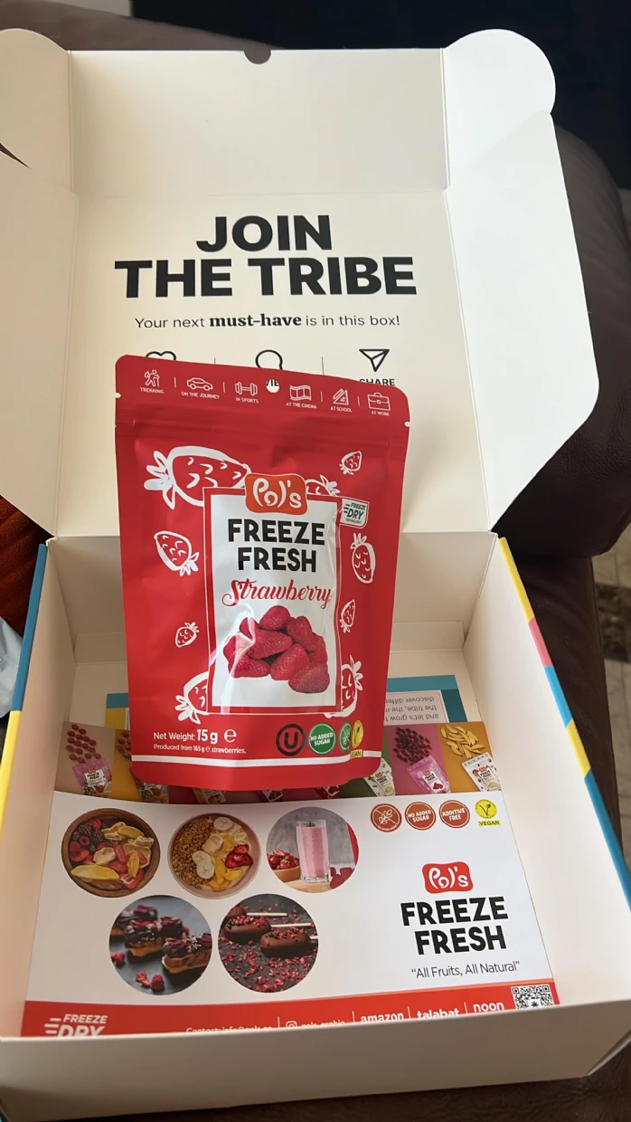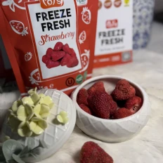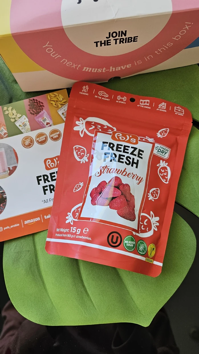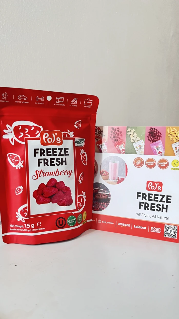 I had never had strawberries as whole in the freeze dried version. It was always slices. But the whole one is so much more wholesome. Its so sweet and delicious, a perfect snack thats low on calories and has no added sugar. Absolutely loving it. Already on my way to Talabat to buy some more packs 😍