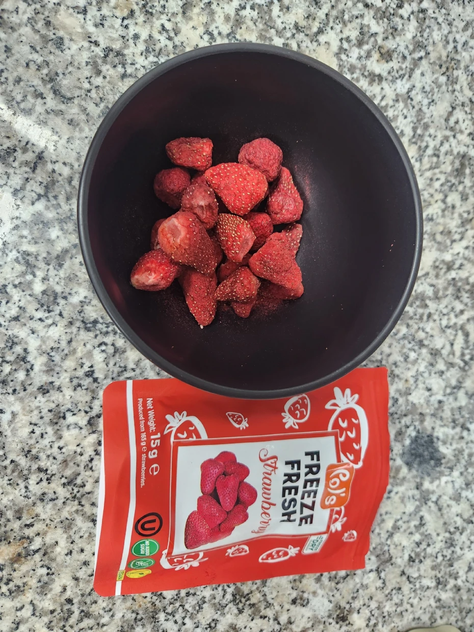 The freeze-dried strawberries were slightly sour, which made them a delightful addition to overnight oats and smoothies. Their natural tartness balanced well with the creamy and sweet elements in these dishes. However, they might be too tangy for snacking on their own unless paired with something sweet. Overall, they work great as an ingredient for enhancing recipes.