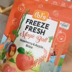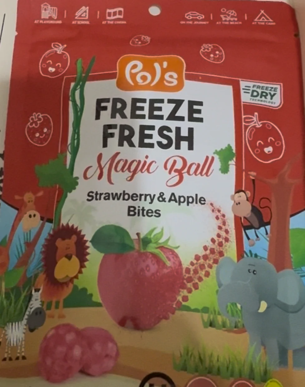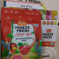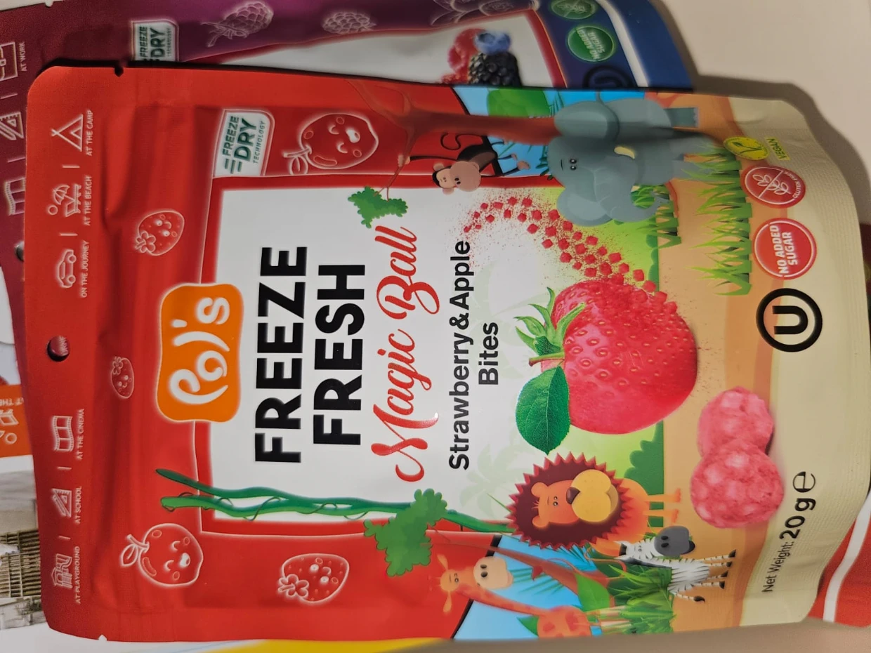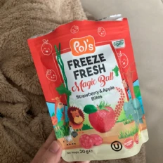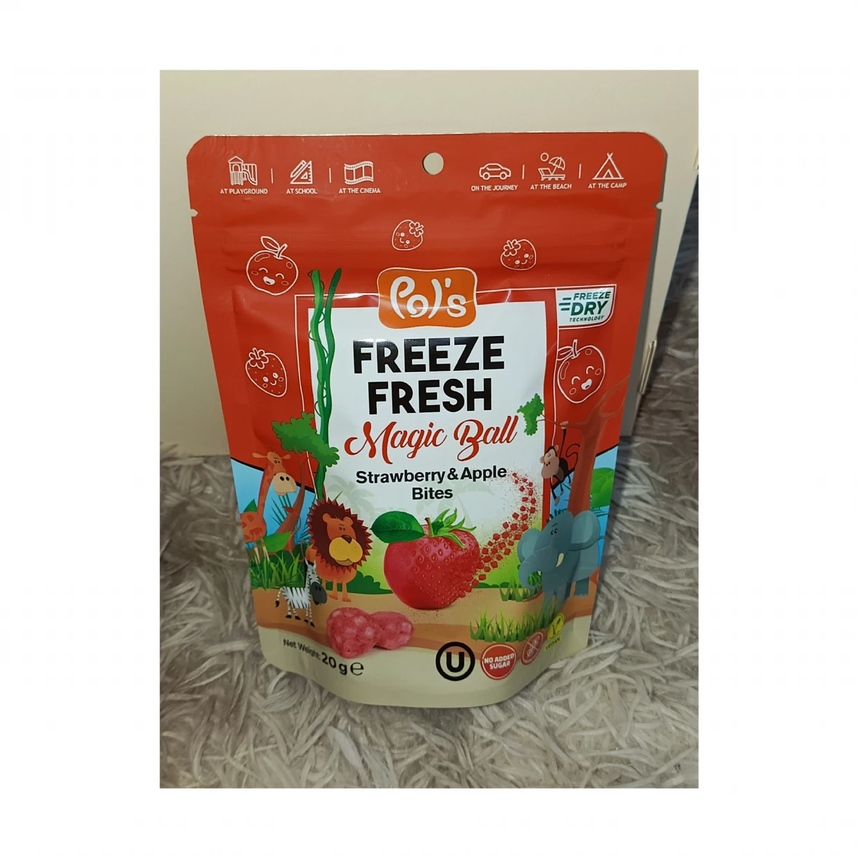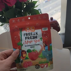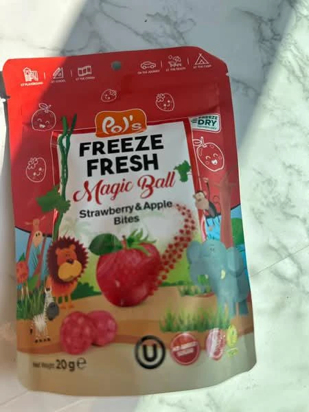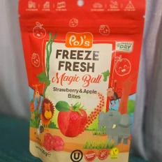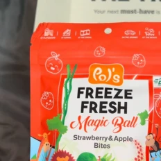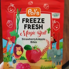 The Pols Freeze Fresh Magic Ball Freeze-Dried Strawberry & Apple Bites are light, crunchy, and packed with sweet, natural fruit flavors. The strawberry is sweet, and the apple is refreshing. They’re great for on-the-go snacking and have no added sugar or preservatives. The texture might take some getting used to, but overall, they’re a fun, healthy snack.