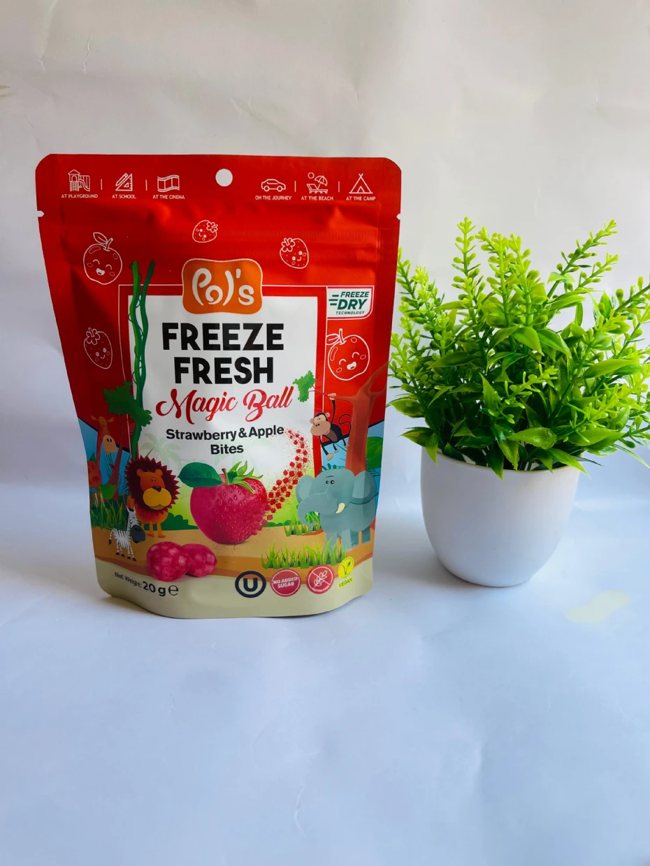 Pols Freeze Fresh Magic Ball Freeze-Dried Strawberry & Apple Bites are the perfect fusion of taste and texture. These bite-sized treats combine the natural sweetness of strawberries and apples with a light, crispy crunch, making them an irresistible snack for all ages.