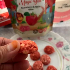 The strawberry and apple bites magic puffy balls are a delightful snack! They have a naturally sweet flavor that comes from the fruit itself, with just the right balance of tartness and sweetness. The airy, puffy texture makes them super light and fun to eat, while still being satisfying. Perfect for a quick snack or even as a healthier alternative to candy. A delicious and wholesome treat that’s sure to hit the spot!