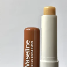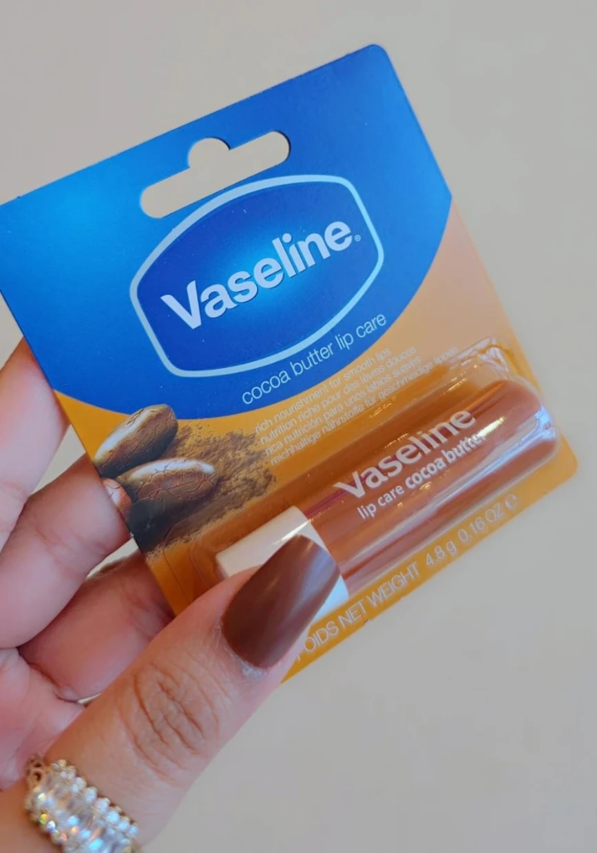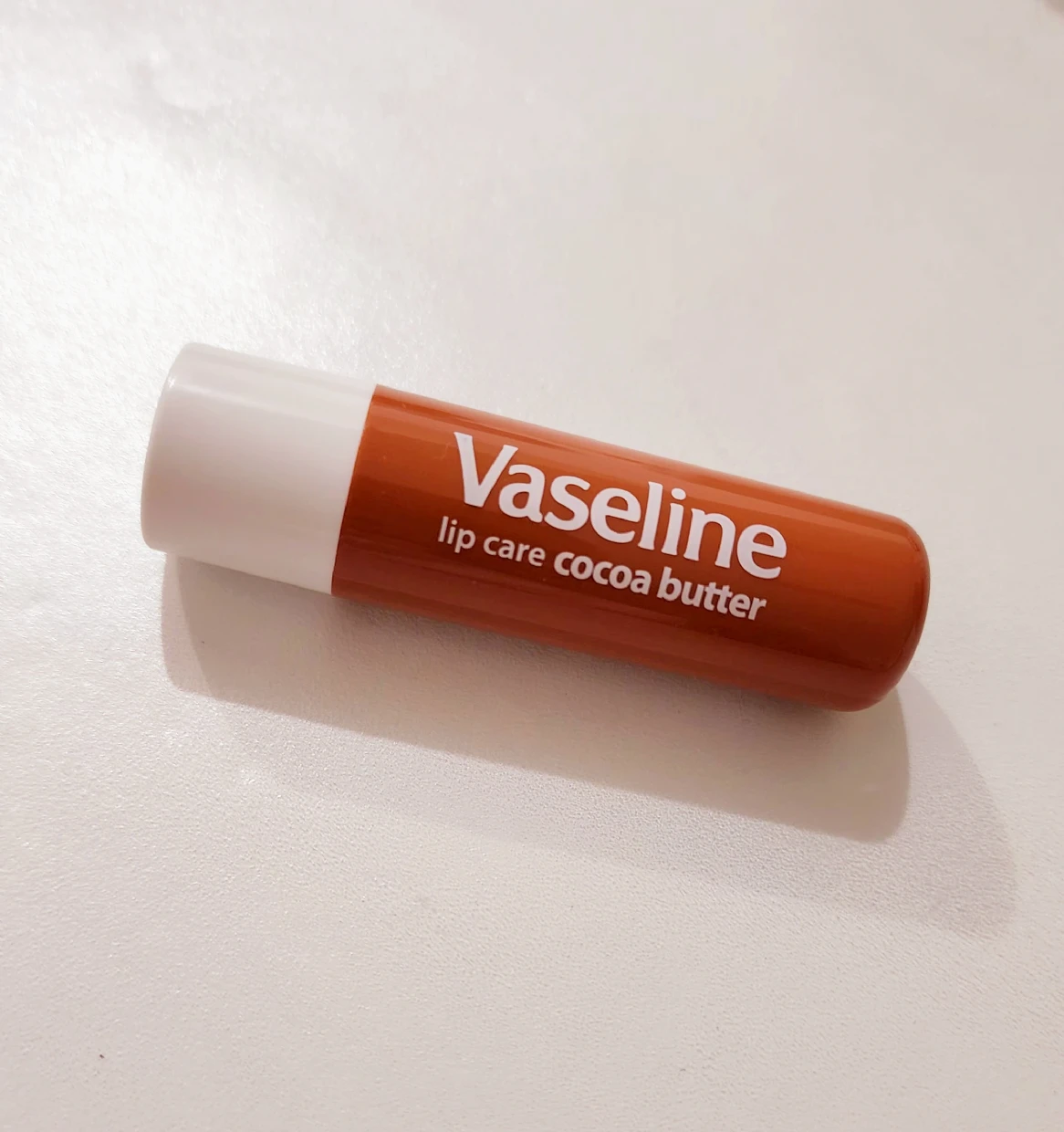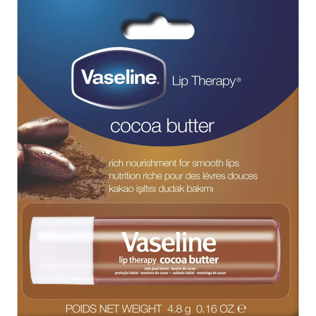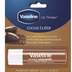 Vaseline Cacao Butter Lip Care deeply hydrates lips with a subtle cocoa scent, leaving them soft and smooth without being sticky.